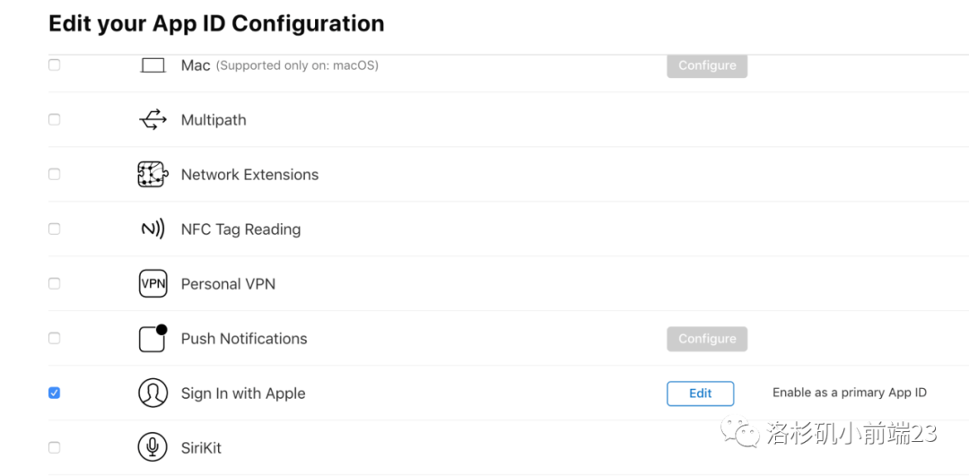开发者后台:进入Certificates, Identifiers & Profiles -> 选择 Identifiers -> 勾选SIWA选项