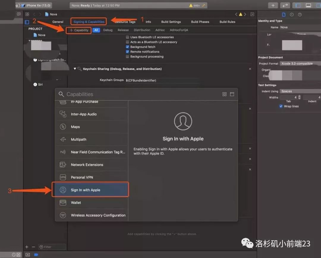 Xcode工具:Xcode选择对应的Target -> select 'signing & capabilities' -> 双击SIWA添加能力