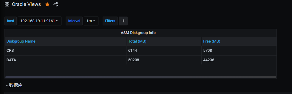 [prometheus@Prometheus ~]$ curl http://192.168.19.11:9161/metrics | grep free_mb# TYPE oracledb_asm_diskgroup_free_mb gaugeoracledb_asm_diskgroup_free_mb{name="CRS",total_mb="6144"} 5708oracledb_asm_diskgroup_free_mb{name="DATA",total_mb="50208"} 44236[prometheus@Prometheus ~]$