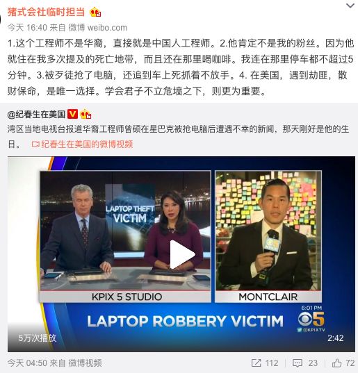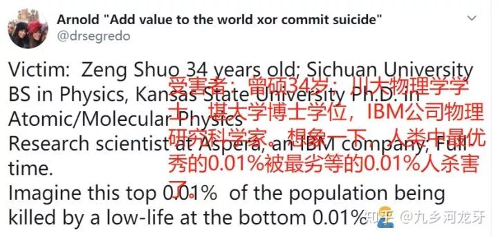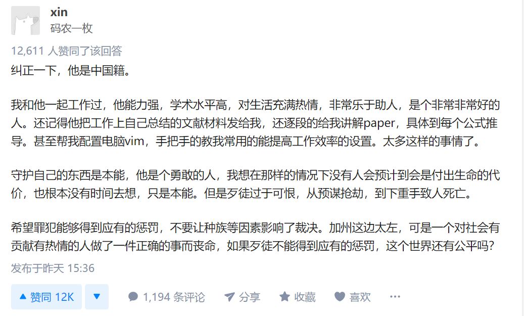 2019 年 12 月 31 日,美国加州奥克兰市的一家星巴克内,34 岁的中国工程师曾硕遭遇一场突如其来的抢劫,贼人抢走其笔记本电脑,曾在追上贼人逃跑车过程中遭车拖行数十米,摔落后不幸身亡。