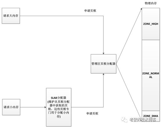 ZONE_DMA是DMA使用的页(DMA是直接路径访问,不经过cpu缓存而直接访问内存)ZONE_NORMAL是正常可寻址的页。ZONE_HIGHMEM是动态映射的页。Linux把系统的页划分为不同的区,形成不同的内存池,这样就可以根据用途进行分配了。其中还有ZONE_DMA32,他只能被32位设备访问。