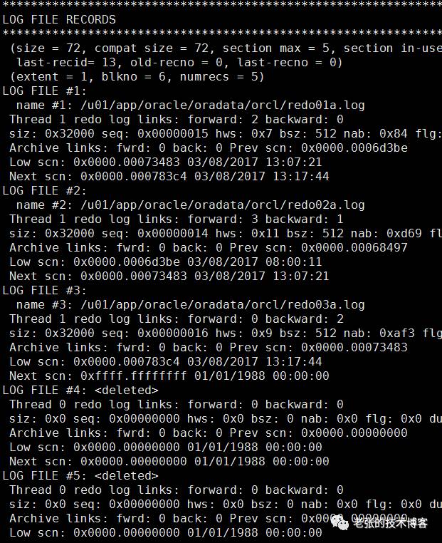 可以很清楚地看到我的数据库里面有五个日志文件。其中每个日志文件都有两个scn,low scn和next scn,他们分别是这个日志文件的低位和高位scn。其中有一个文件比较特殊,第三个日志文件的结束scn是无穷大的,这说明这个文件目前正在被使用。利用这一点可以确定需要恢复的信息位于哪一个日志或归档文件中。
