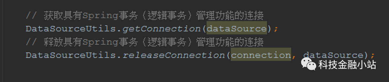 这里需要使用工具类获取连接和释放连接,如使用org.springframework.jdbc.datasource包中的 DataSourceUtils 类来获取和释放具有逻辑事务功能的连接。当然对集成第三方ORM框架也提供了类似的工具类,如对Hibernate提供了SessionFactoryUtils工具类,JPA的EntityManagerFactoryUtils等,其他工具类都是使用类似***Utils命名。