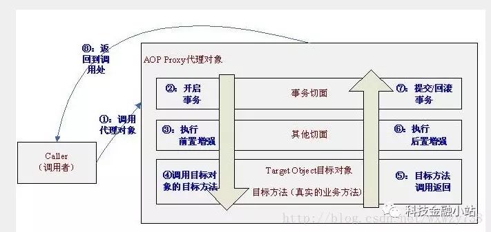 如下图(网上截取)是通过AOP代理后的代码调用流,调用者首先调用的是AOP代理对象而不是目标对象,首先执行事务切面,事务切面内部通过TransactionInterceptor环绕增强进行事务的增强,即进入目标方法之前开启事务,退出目标方法时提交/回滚事务。