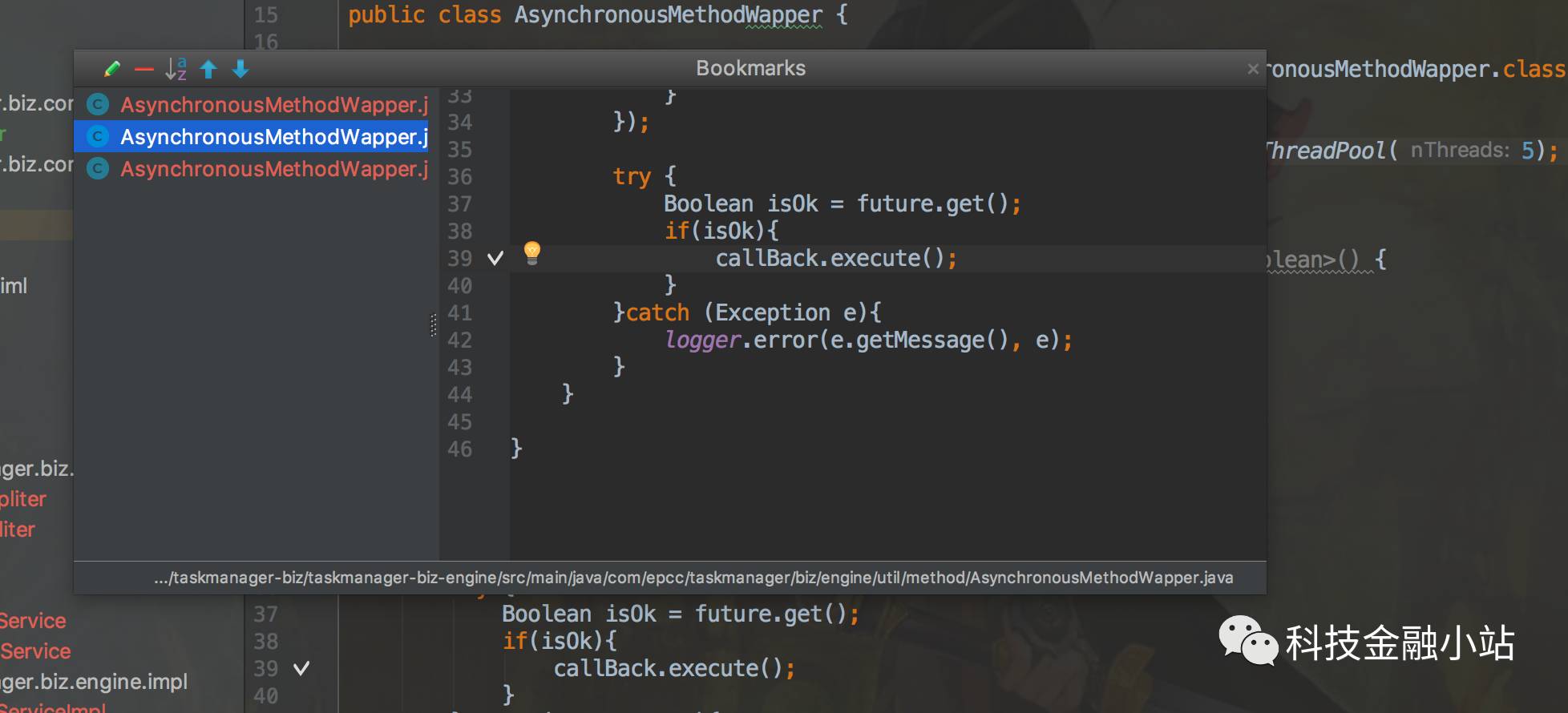当需要查看书签时,可以按快捷键(MAC:Command+F3;Win:Shift+F11),弹出如下创建显示书签内容,可以通过上下光标键在多个标签上切换,并且可以按回车进入书签标记的代码编辑窗口: