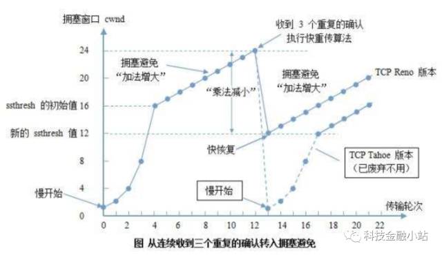 与快重传配合使用的还有快恢复算法,当发送方连续收到三个重复确认时,就执行乘法减小算法,把慢开始门限ssthresh减半。这是为了预防网络发生拥塞。请注意,接下去就不再执行慢开始算法了。由于发送方现在认为网络很可能没有发生拥塞,因此与慢开始不同之处是现在不执行慢开始算法,即把拥塞窗口cwnd的值设置为1,而是把cwnd值设置为慢开始门限ssthresh减半后的数值,然后开始执行拥塞避免算法,使拥塞窗口慢慢的线性的增大。