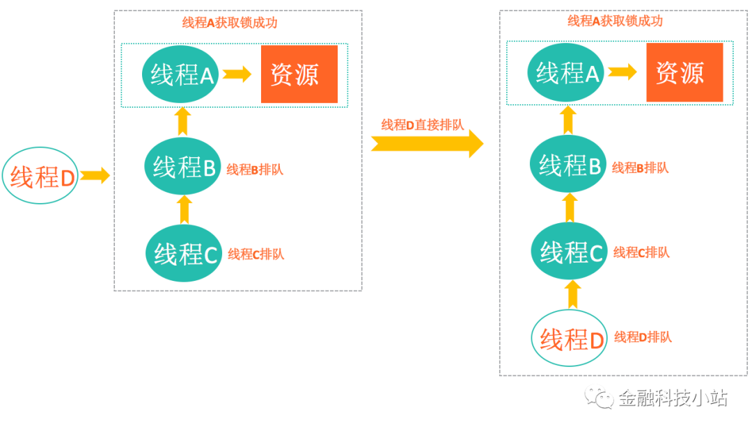 缺点:是整体吞吐效率相对非公平锁要低,等待队列中除第一个线程以外的所有线程都会阻塞,CPU唤醒阻塞线程的开销比非公平锁大。