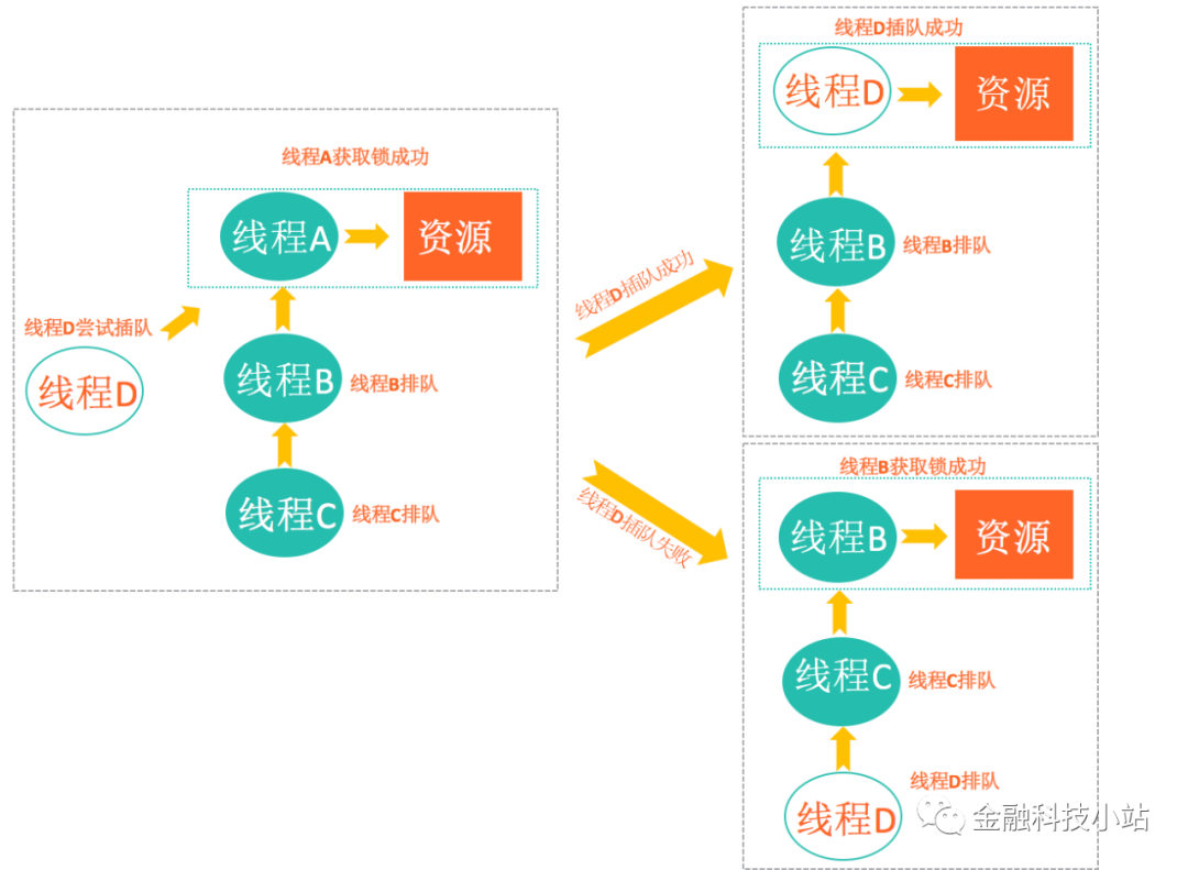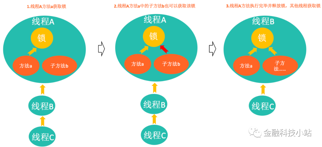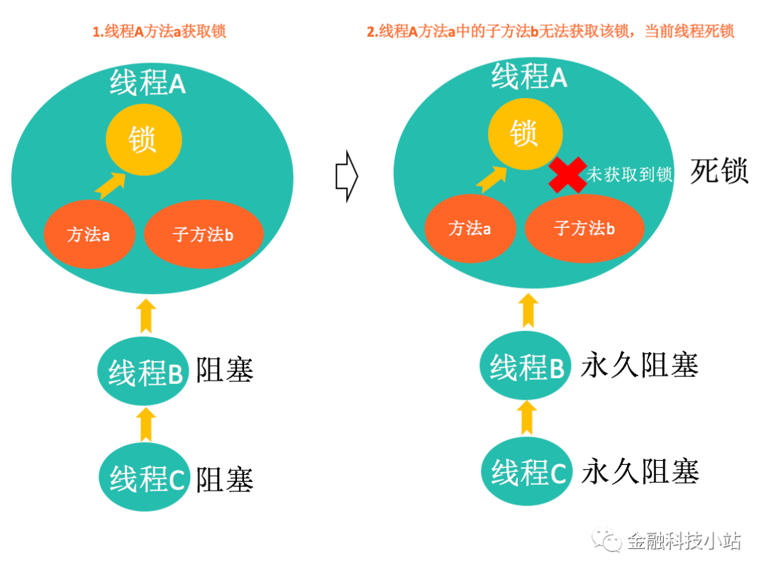 不可重入锁:相对于可重入锁而言,当前线程在调用子方法时需要释放当前锁,实际上该对象锁已被当前线程所持有,且无法释放。所以此时会出现死锁
