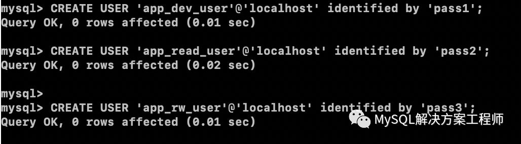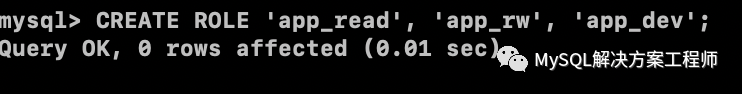 创建角色使用 “CREATE ROLE”语句,假设我们为应用程序创建只读角色、读写角色和开发人员角色。