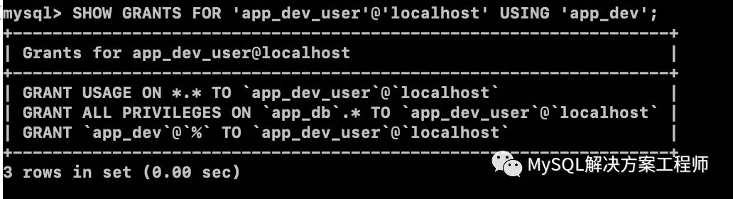 是否注意到,执行show grants语句只是看到了用户被赋予了角色,该角色具有哪些权限该如何查看呢?执行下面的语句可以确认相关内容: