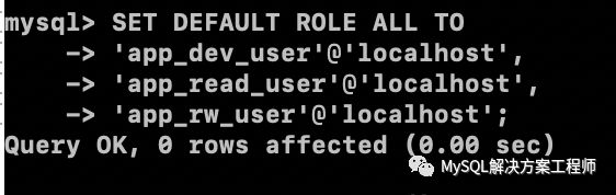 默认情况下,向帐户赋予角色或在mandatory_roles系统变量值中为其命名后,该角色在帐户会话中不会变为活动状态。要指定每次用户连接到服务器,进行身份验证时激活角色,请使用 SET DEFAULT ROLE: