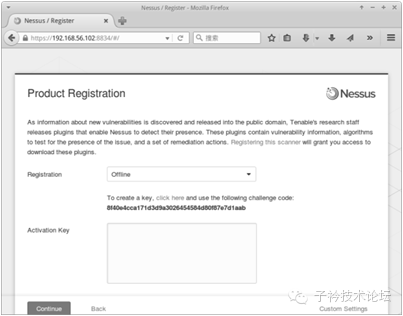 4、按“继续”按钮之后要求注册。由于在线访问软件开发商tenable网站的速度比较慢,这里选择“Offline”离线注册,在页面中部可以得到challenge code。然后到https://www.tenable.com/register注册。注册时填写的邮箱中将收到Activation Code。