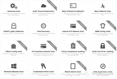 1)通用扫描策略,如Basic Network Scan、Windows Malware Scan、Mobile Device Scan;