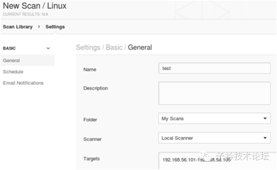 13、Nessus策略创建完成后,依次点击Scans–New Scan–User,利用已有的策略创建扫描项。这里只需要填写名称及目标地址即可。注意,home版只能并发扫描16台主机: