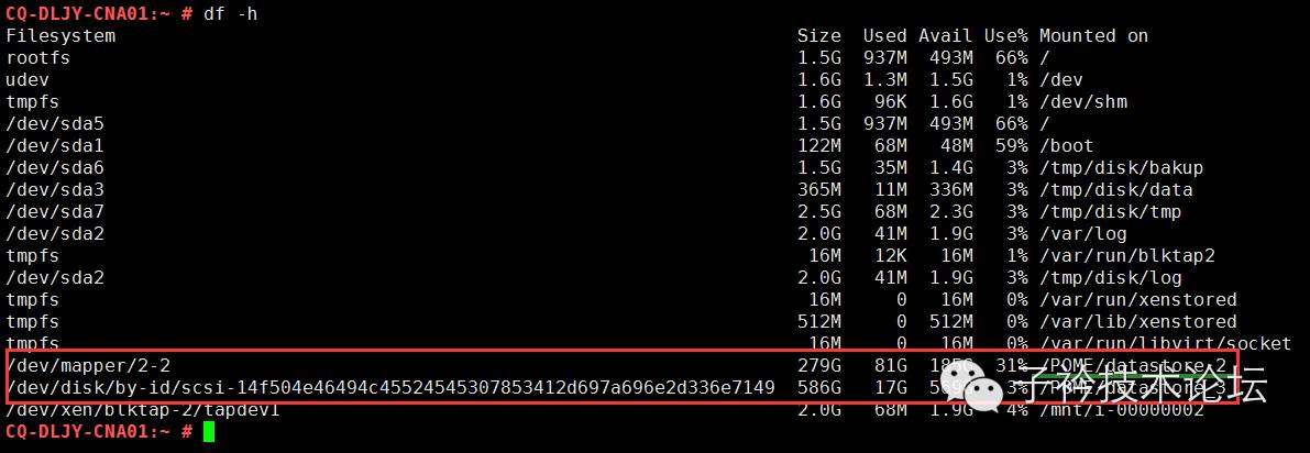 2、我们要先知道哪块盘是我们的本地存储盘,/dev/mapper/2-2就是我们本地硬盘的设备/POME/datastore_2挂载点,之所以我们能够知道这个/dev/mapper/2-2是我们的硬盘那是因为我们本地硬盘的空间就是一个300G的硬盘。从磁盘的空间就能看出来哪块盘是我们的本地硬盘。