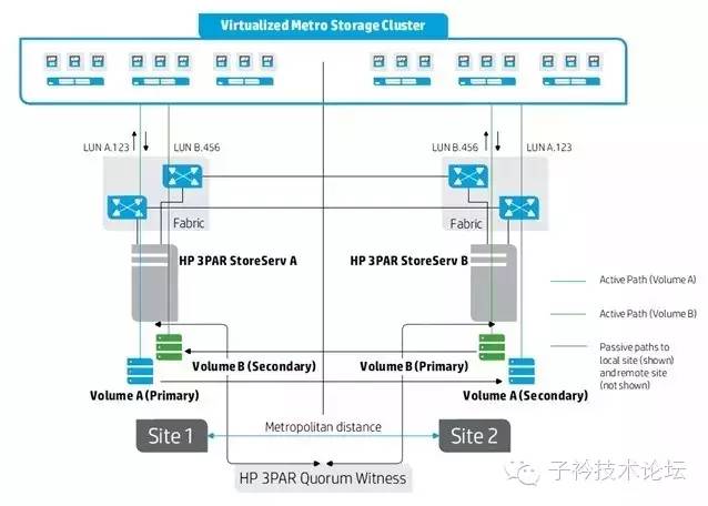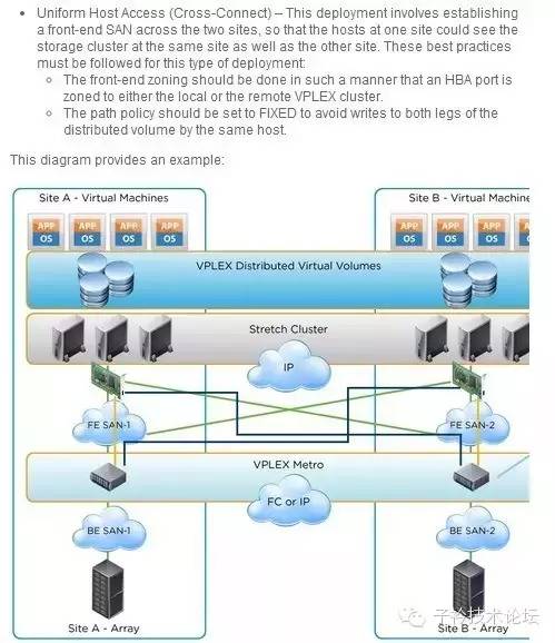 另外一种组网方式就是统一的主机访问(交叉连接)。主机的HBA同时连接两边站点的VPLEX存储设备。这个需要实现跨站点的Fabric。