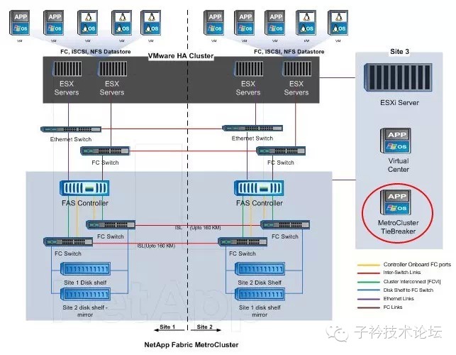 另外一种方式就和其他厂商一样了,需要跨站点的Fabric。这种组网方式NetApp叫做Fabric MetroCluster。
