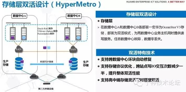 就当前成熟技术来讲,存储双活分为阵列形态和网关形态两种双活。目前只有HDS高端存储VSP G1000的GAD做到了业务级别的双活,即对于同一个LUN,两个数据中心都是可以同时读写的,这种双活可以和ORACLE RAC并行数据库完美结合,提供更均衡的容灾。其他的厂商,主要都是主从方式,平时从LUN是不能写的(有些厂商可以实现从阵列也可以接受写请求,但需要通过Proxy的方式转发到主阵列,因此也不能同时写同一个LUN)。因此,只能做到运营级的双活,即有些业务跑在A中心,有些业务跑在B中心,故障后才切换。但网关方式,大部分厂商都是可以实现业务双活的。可见,采用网关实现业务双活比较普遍,而采用阵列实现好像很少。