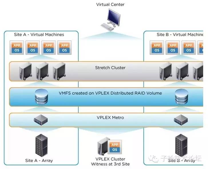VPLEX网关形态双活,采用在第三站点的仲裁机制。Witness可以用一个VM来实现。