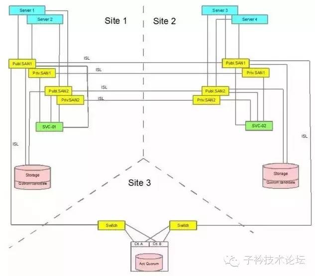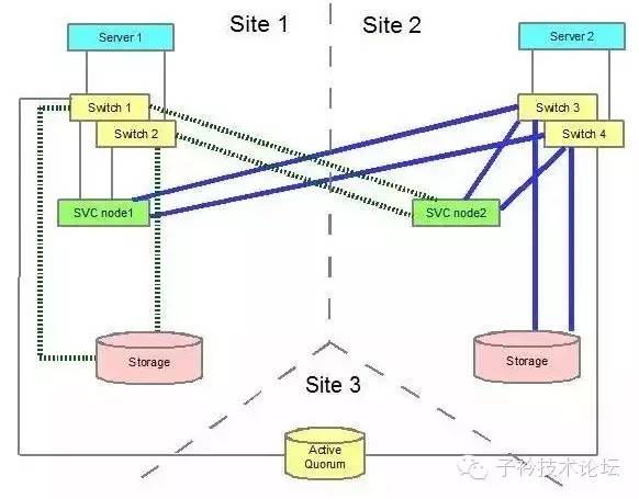 我们看到,两种组网都需要部署第三站点的仲裁机制。而且,IBM SVC也是唯一一个具有备份仲裁机制的厂商,当活动仲裁磁盘不能访问,备份仲裁磁盘可以接替其工作。