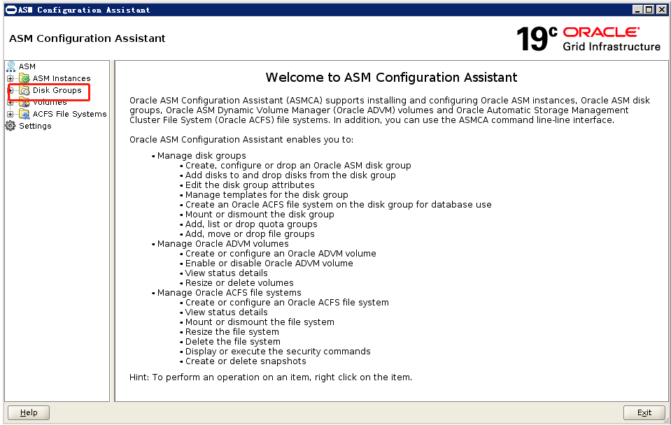 [root@vmrh-oracle1 ~]#su - grid[grid@vmrh-oracle1 ~]$export DISPLAY= client_IP:0.0[grid@vmrh-oracle1 ~]$asmca