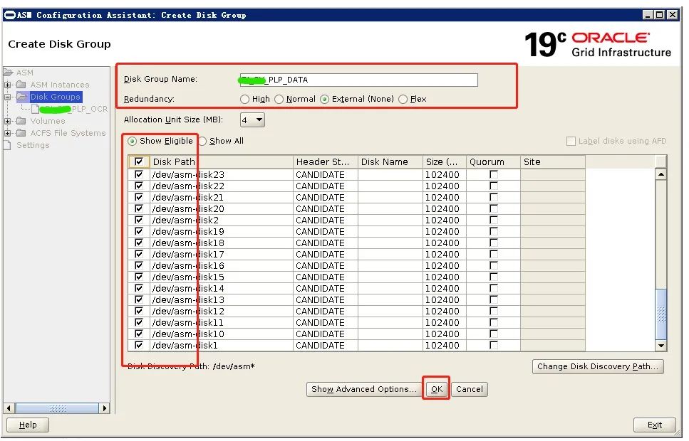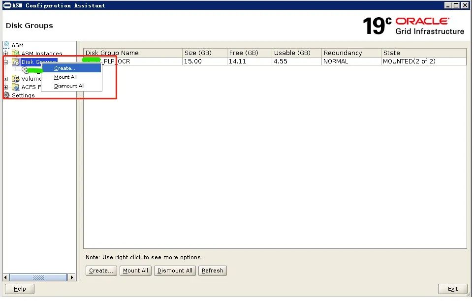 可以看到,ASM中已经存在了一个OCR磁盘组,现在要给数据库创建DATA磁盘组,选择【Disk Groups】选项卡,点击左下角【Create】。
