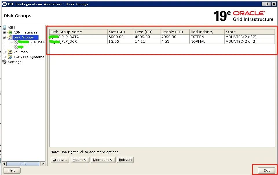 现在可以看到,Grid管理的两个磁盘组**_PLP_DATA和**_PLP_OCR,并且需要点击左下角【Mount All】,使得两个节点均mount上该磁盘组,注意右侧的状态应当为【Mounted(2 of 2)】查看创建磁盘组,点击Exit。