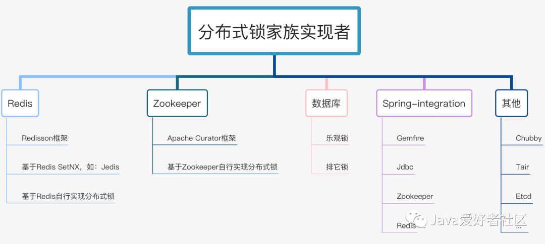 思维导图做了一个简单分类,不一定特别准确,几乎包含了分布式锁各个组件实现者。
