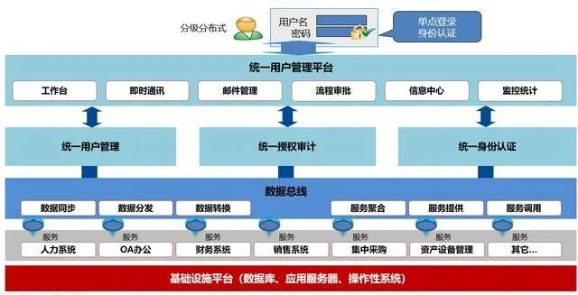 通过统一身份管理平台将资源进行抽象解耦整合,转化为场景化应用可复用、易共享的核心能力,既包括了企业通用的基础服务组件、数据管理标准和共享运营中心,也包括面向不同行业场景中的行业共用的基础信息管理。