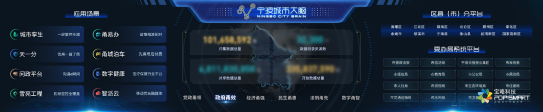 宁波城市大脑:宁波数字化改革重大标志性工程,按照浙江省数字化改革“1+5+2”的架构,构建了政府甬效、经济甬强、民生甬惠、法治甬先、数字甬智六大应用,汇集了25个部门系统、100多亿条数据,并在L屏上集中展示。