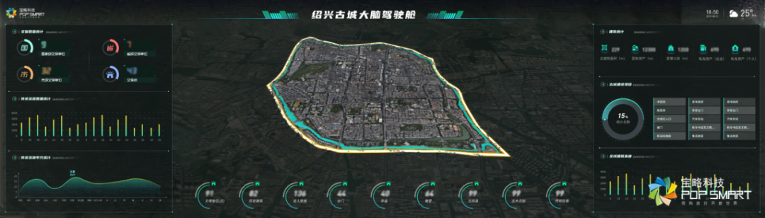 绍兴古城保护驾驶舱大屏:绍兴古城保护“数字大脑”已构建起全方位、立体式、数字化保护体系,通过对古城内的现状、风貌、格局和建筑风格等对象进行数字化扫描,建立可视化的实景模型,打造成全风貌、大格局数字化管控体系。古城保护“数字化大脑”还利用“互联网+大数据引导”的管理理念,助力全区域、惠民数字化服务体系,实现古城休闲旅游便捷化、城市管理精细化。
