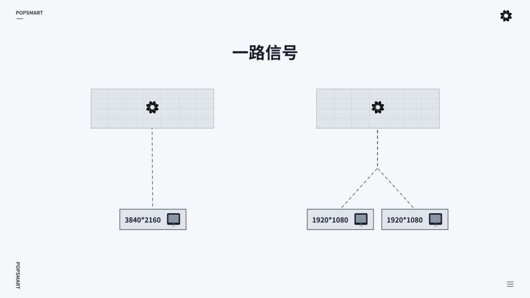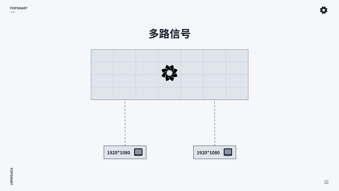 投射的信号输入可以是一台显示器,也可以是多台显示器组合;可以是一路信号,也可以是多路信号。(如下图)