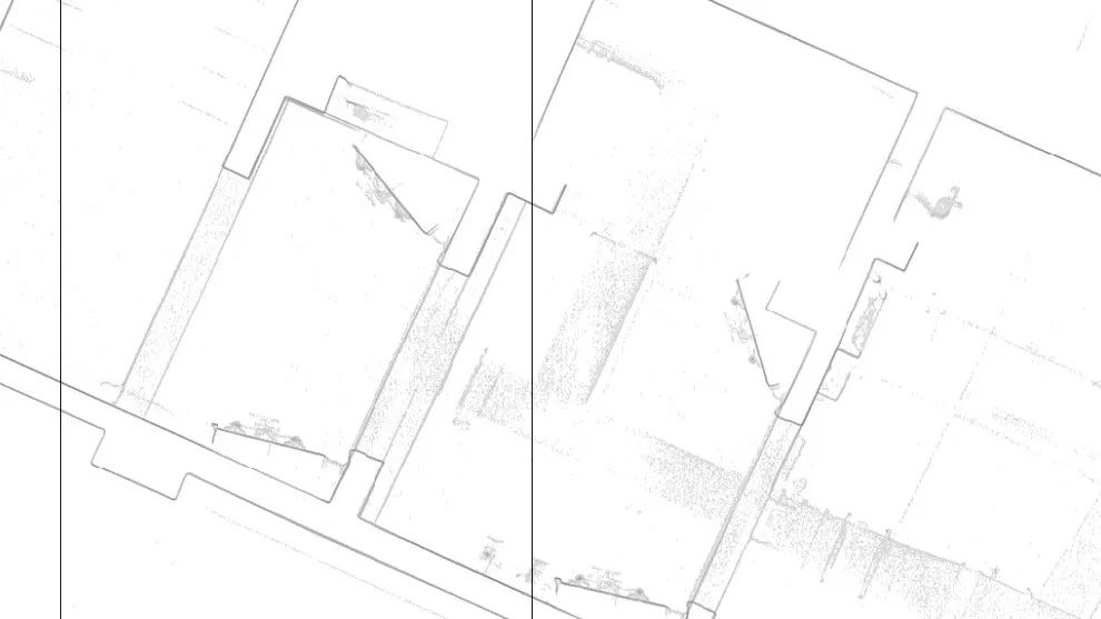 在SLAM和BIM融合技术路线中,点云数据的转换导入与算法拟合是数据转换和处理的关键。BIM软件中不仅可以显示三维扫描点,还可以显示截面图像。点云数据定义的裁剪区域,会被转换为具有阈值的密集点栅格化png图像;而这个转换后的图像可以被自动插入到平面视图中,为后续具体构件绘制生成工作提供重要参考。