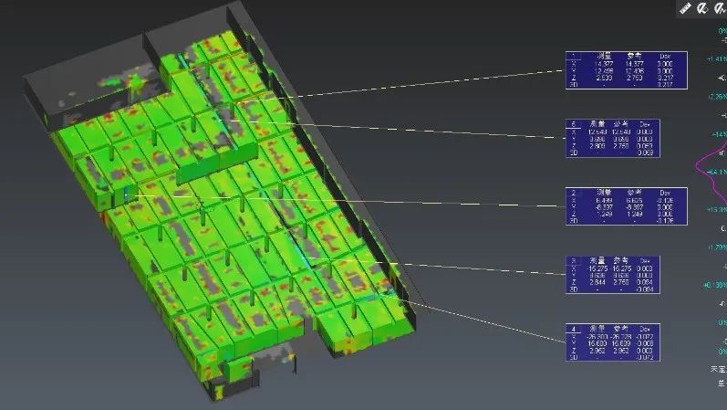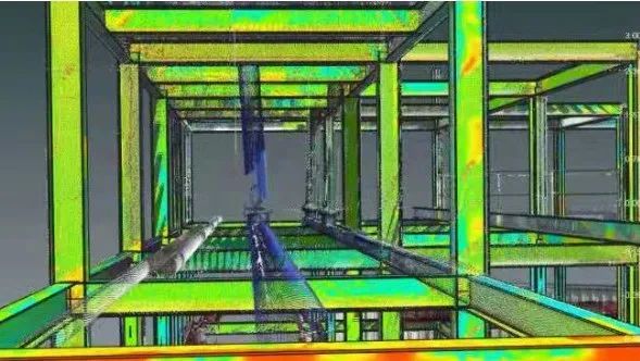 随着施工进行,建筑物负荷不断增加,加上各种外部因素,过程中会发生沉降、位移、局部形变的情况。通过测量技术和BIM技术的融合,只需要在每隔一定时间内对现场数据进行SLAM点云数据采集,同时和BIM模型进行坐标匹配和对比,就可以轻松找到差异值,实现沉降、位移、形变的位置和变化量的监测。