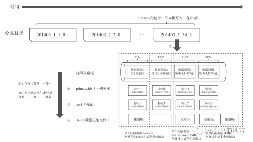 标记文件与.bin文件也一一对应,每一个[Column].bin文件都有一个对应的[Column].mrk文件,记录数据在.bin文件中的偏移量信息。