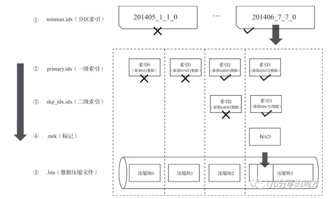 稀疏索引,找到对应数据的偏移量信息(.mrk),然后通过偏移量直接从.bin文件中读取数据。