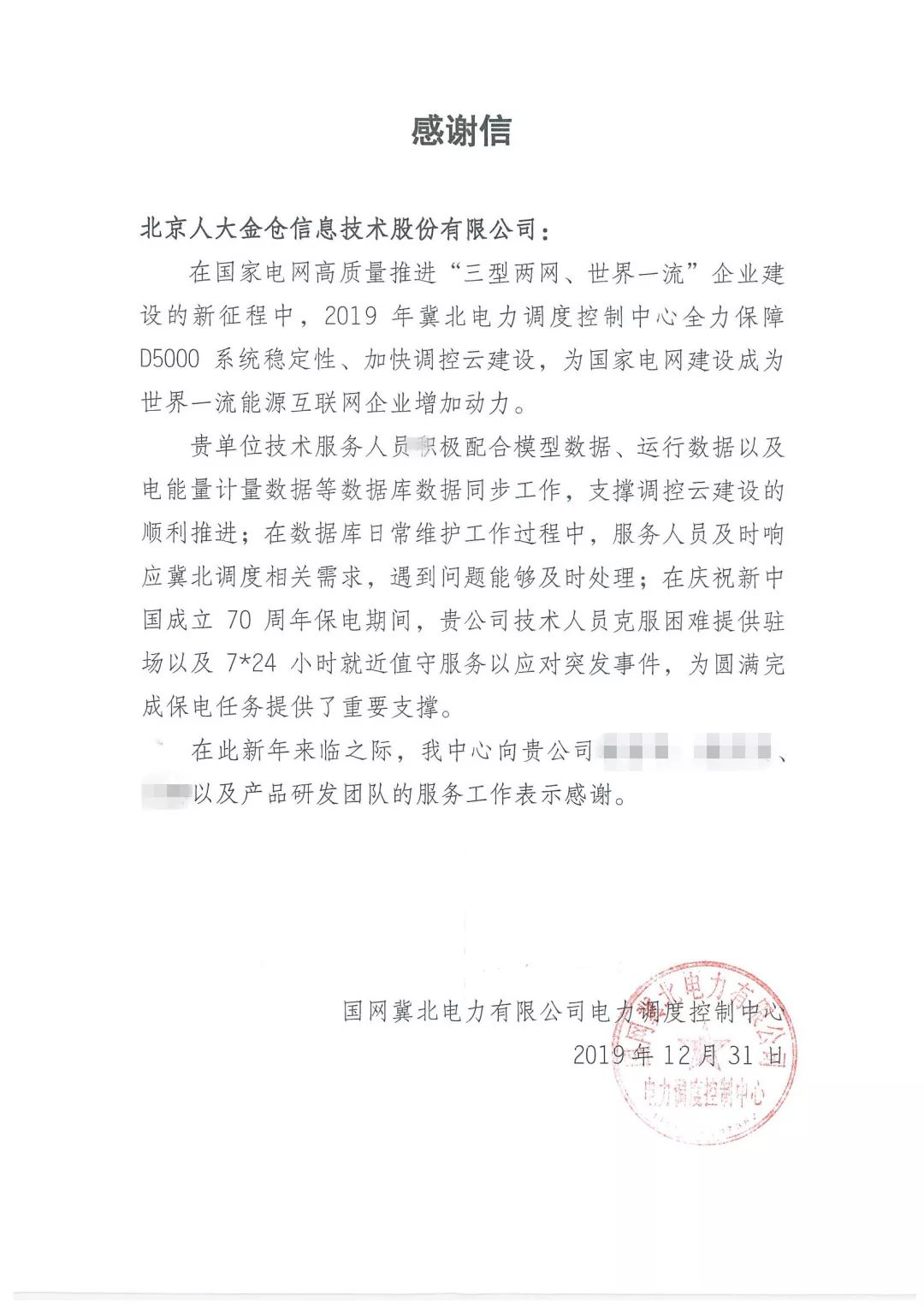 继1月1日首单开门红后,公司近日陆续收到电力行业感谢信多达10封,包含华北网调、北京市调、西藏区调等在内的国家电网下辖7家电力调控中心及国电南瑞南京配电分公司、南京四方亿能、南瑞继保3家集成商单位,充分彰显了多家客户单位对人大金仓产品与服务的高度认可及信赖。