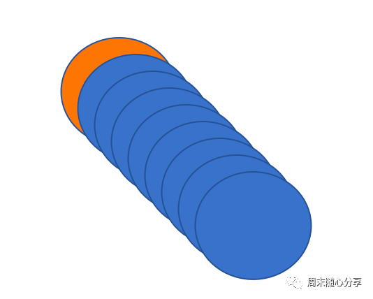其中mScrawlCount就代表完全擦除的步数,而之所以要除以BEZIER_INSERT_POINT是因为在每次滑动过程中为了边缘更加圆滑我们会插入一些贝塞尔点进行重叠绘制,类似下面这张图,橙色圆被多个蓝色圆重叠