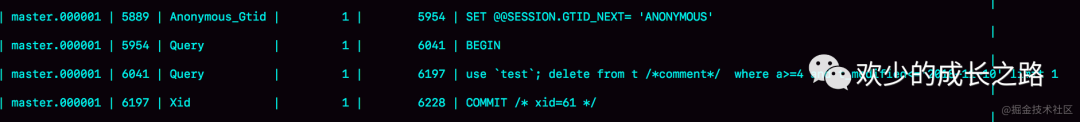 最后一行是一个 COMMIT。你可以看到里面写着 xid=61。