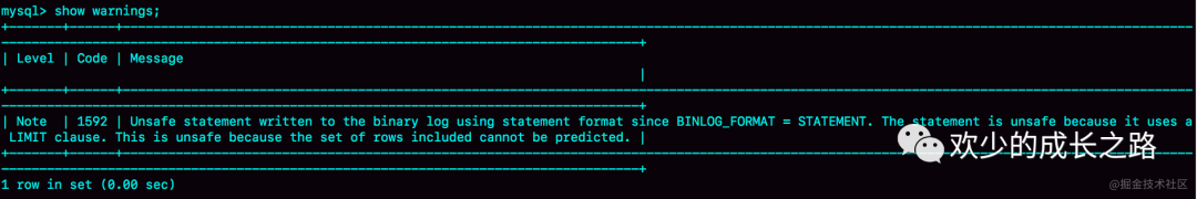 可以看到,这条delete产生了一条warning。是因为当前binlog设置的是statement格式的。并且delete带有limit,很可能会出现主从库数据不一致的情况。比如上面这个例子。
