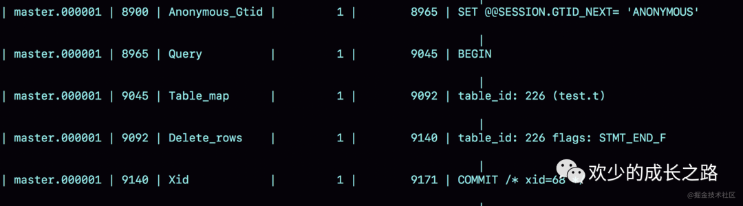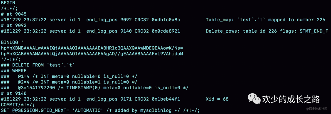 可以看到,与 statement 格式的 binlog 相比,前后的 BEGIN 和 COMMIT 是一样的。但是,row 格式的 binlog 里没有了 SQL 语句的原文,而是替换成了两个 event:Table_map 和 Delete_rows。