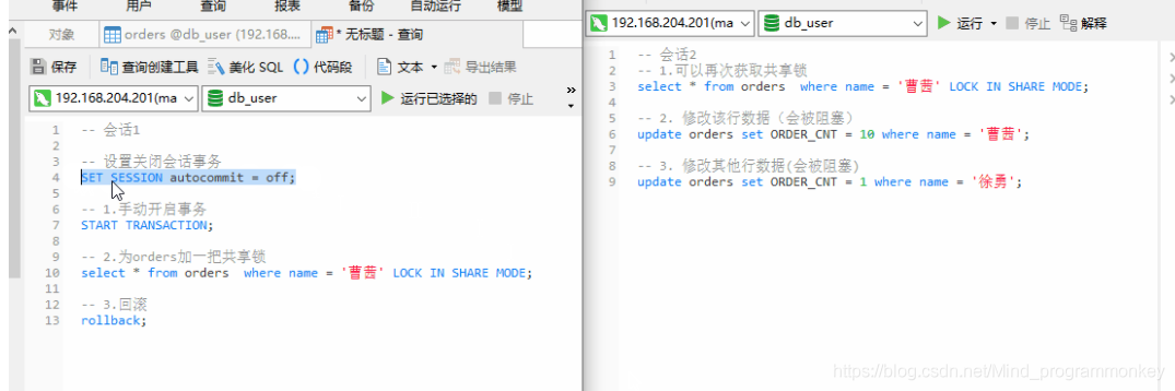 // 在查询语句末尾,需要通过LOCK IN SHARE MODE的方式添加共享锁select * from users where id = 1 LOCK IN SHARE MODE;
