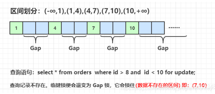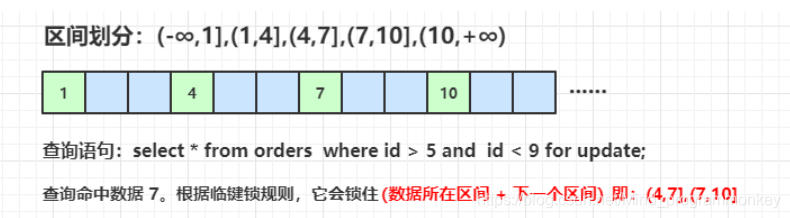 我们使用 SQL 进行查询。针对 orders 表中的数据,InnoDB 引擎会将数据进行如下区间划分:并锁住当前数据所在区间+下一个区间。