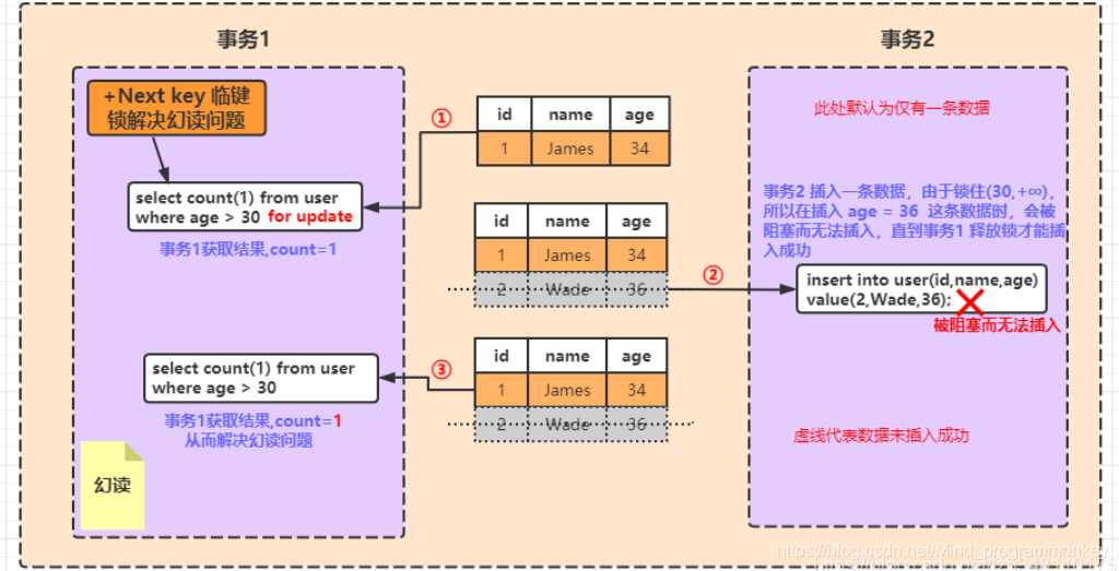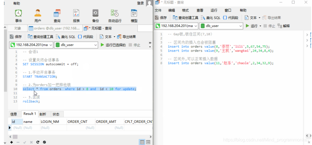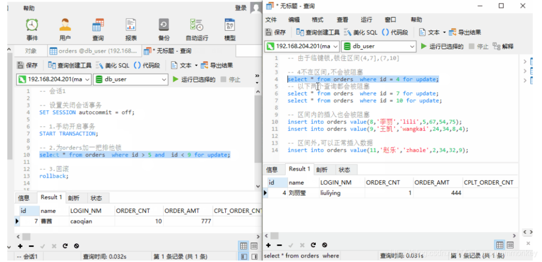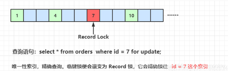 select * from users where id = 1 LOCK IN SHARE MODE; //共享锁,该行只能读不能修改delete update/insert 以及select * from users where id=1 FOR UPDATE 加入排它锁,这一行不允许和别的锁共存。select * from orders where id>5 and id<9 for update; next-key lock;//命中数据;命中索引;范围查询;锁住(4,7] (7,10]select * from orders where id>8 and id<10 for update; 查询记录不存在,命中索引,范围查询,锁住(7,10)select * from order where id=7 for update; 唯一性索引查询(主键索引、唯一性索引) 精确等值查询;数据命中;InnoDB中的行锁实现依赖与索引,一旦某个加锁操作没有使用到索引,那么该所就会退化成为表锁;