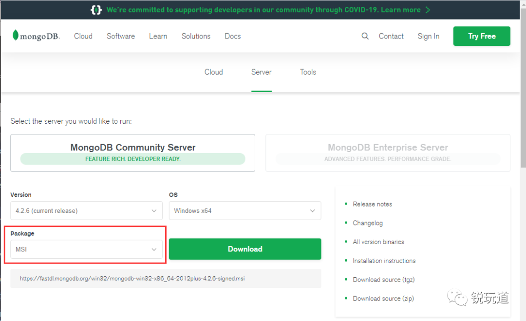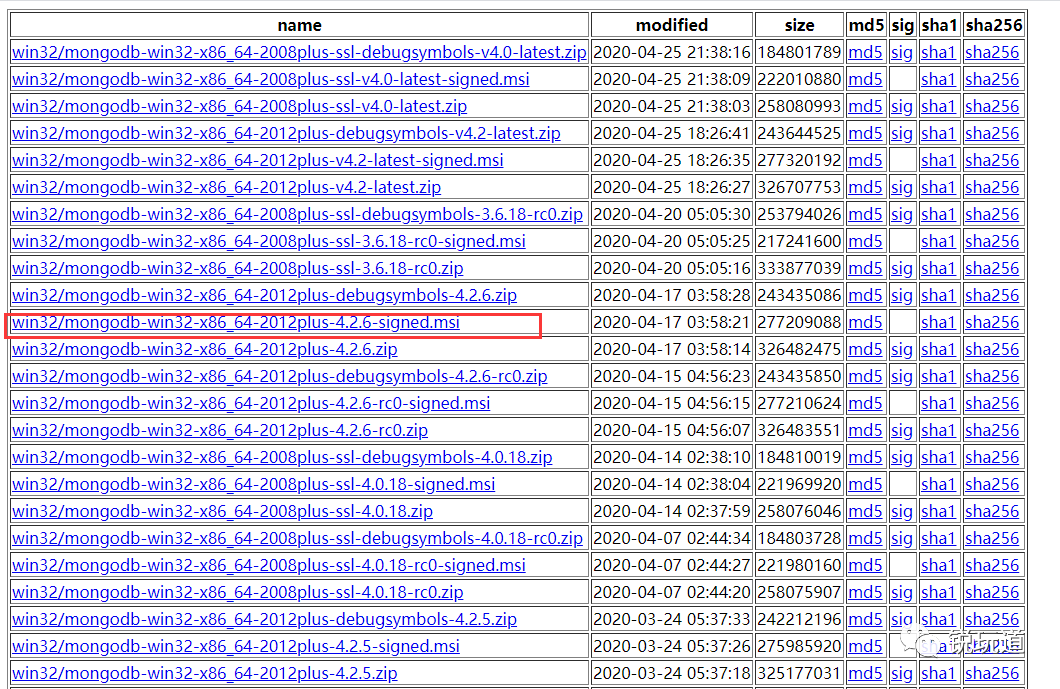 既然官网下载不了怎么办呢,我们可以直接到mongodb下载列表[3],下载自己需要版本。我这里下载 mongodb-win32-x86_64-2012plus-4.2.6-signed.msi