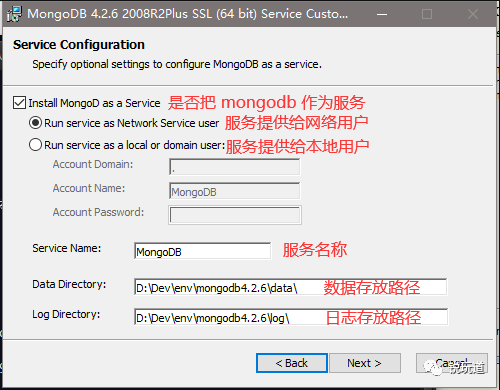 •Install MongoDB as a Service 将 MongoDB 添加到计算机服务列表。•Data Directory/Log Directory 路径是否自己想要。然后下一步