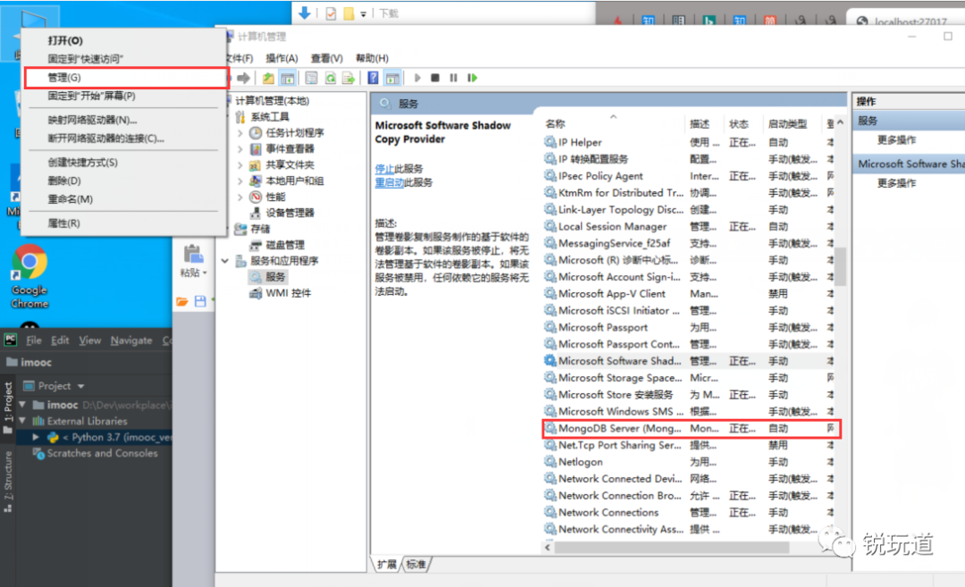 右击我的电脑 > 管理 > 服务与应用程序 > 服务 > 查看列表中 是否存在 MongoDB Server,有时候会出现服务列表没来得及刷新