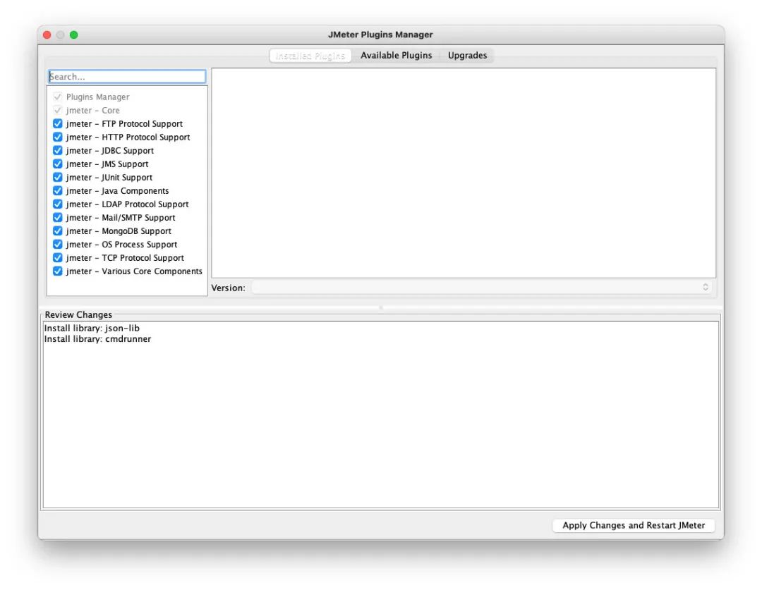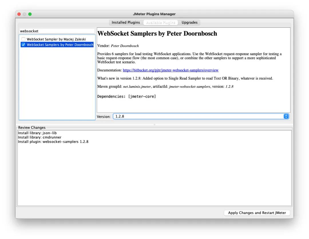 在「Abaliable Plugins」搜索「websocket」选择「Websocket Samplers by Peter Doornbosch」后点击「Apply Changes and Restart Jmeter」
