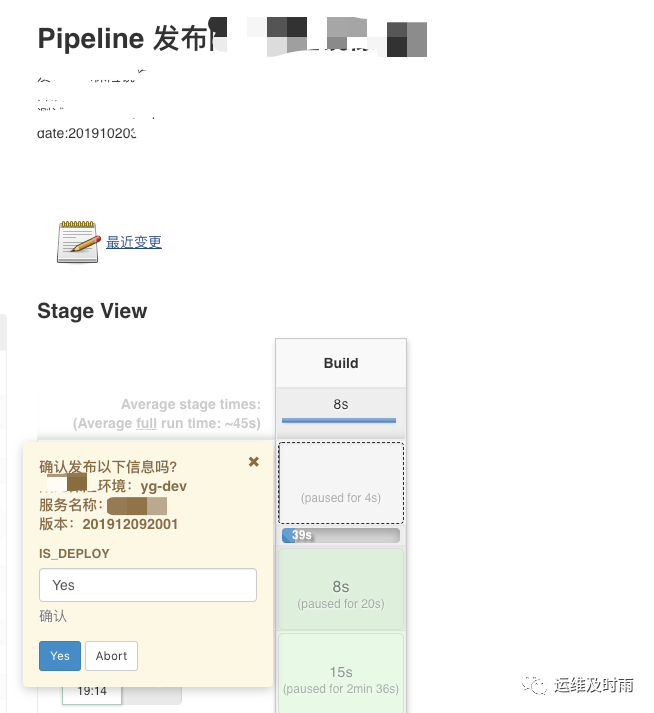 这个时候会弹出再次审核的信息,在上面的pipeline里我们定义了默认值"Yes",所以这里只有单击"Yes"后才会发布,否则程序会一直等待用户做出选择: