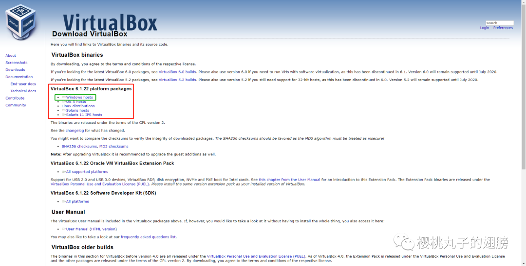1、Virtual Box的下载地址:https://www.virtualbox.org/wiki/Downloads 选择对应的platform packages。如下: